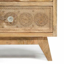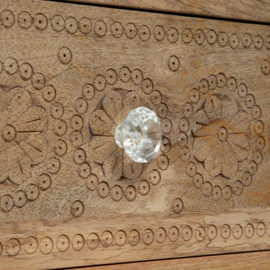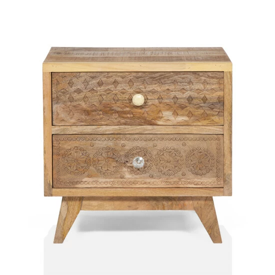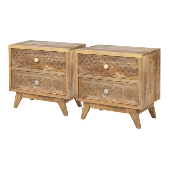 Perfect your Bohemian-style bedroom with this set of 2 artful bedside tables. The intricately carved drawer facets and mix-matched knobs are unique qualities that serve this nightstand a unique design. All atop tapered and splayed feet, this stand is made from Mango wood. The Indian native wood is harvested by fruit farmers after bearing produce. This eco-friendly process would otherwise add to air pollution through the burning off of mango trees.