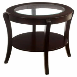 Take a classic approach to sophisticated design, choosing a deep, dramatic finish over wood to refine and add elegance in a custom living room or family entertaining space. The Orim modern oval end table from Furniture of America presents upscale beauty with a romantic silhouette. Its engaging dual-layer configuration adds depth and dimension, with an oval tabletop and lower shelf offering space for storage. Beautifully curved legs taper at the bottom, accentuating its overall finesse. A deep espresso finish offers compatibility with most palettes, as a clear tempered glass inset adorns its top surface with gleaming charm. This end table is made from solid wood and veneer.