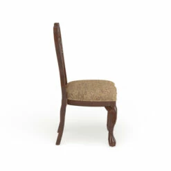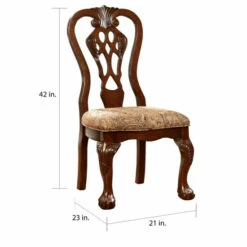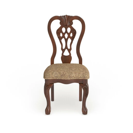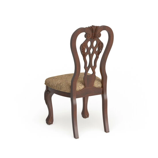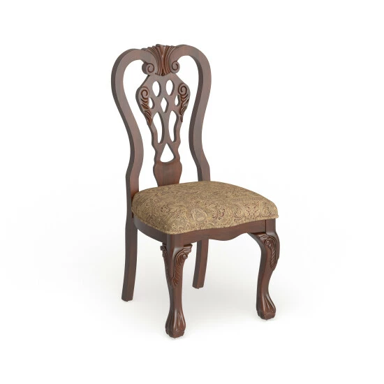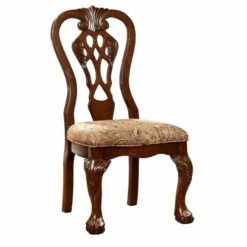 Warmly finished in a smooth brown cherry, this set of two elegant dining chairs offer the perfect amount of formality and comfort to host lavish gatherings with friends or family. The intricate carvings found along the chair back add an air of elegance to pair with the printed seat cushion, enhanced with comfortable cushioning for your dining pleasure. Both carving details and various cut-out designs on the backrest enhance the look of this set of upholstered dining chairs, with lion claw feet making for an exquisite addition to a formal or traditional eating space. Add it to your formal dining table or create a new level of stylish appeal by using them as side chairs.