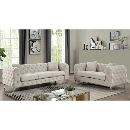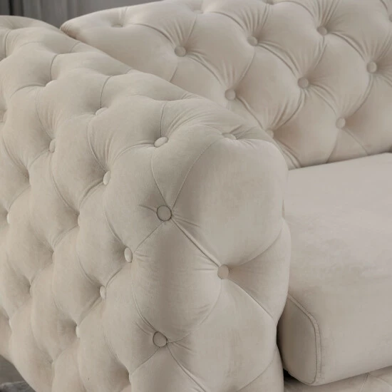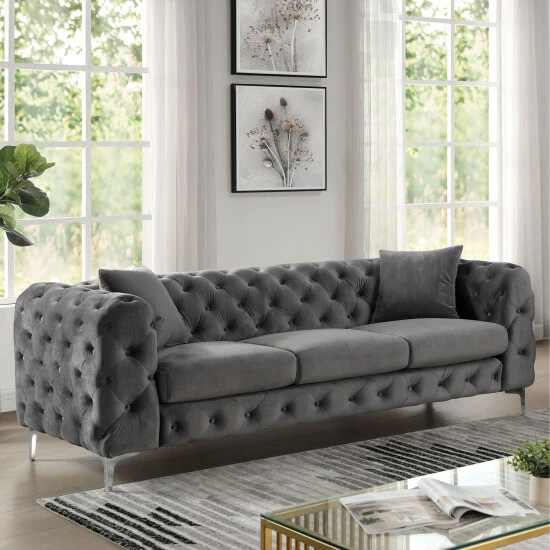 The ultimate in elegance by day and in comfort by night, this contemporary sofa makes a bold statement. Button tufting adds exceptional dimension while smooth seats create engaging contrast. Velvety upholstery ensures a soft feel no matter the occasion.