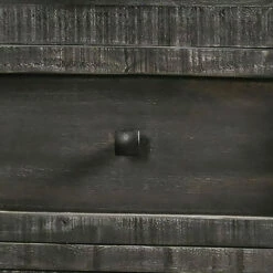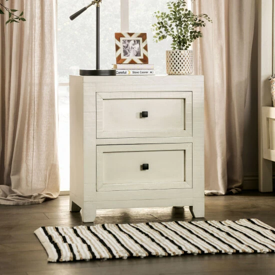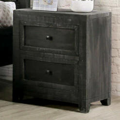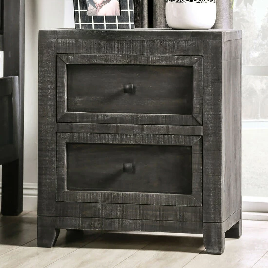 Complement a welcoming, relaxed bedroom with this rustic two-drawer nightstand. Drawer fronts feature a simple panel design, each with square, black knobs that complement a distressed finish. Dovetail drawer construction and ball-bearing glides add a smooth finish.
