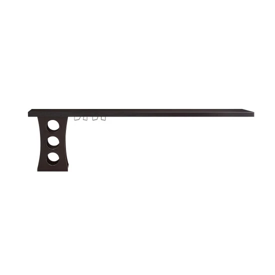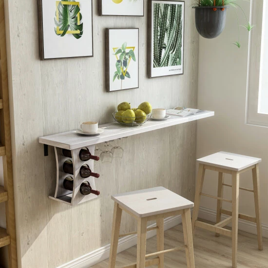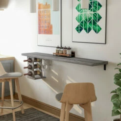 Upgrade your entertainment room, dining room, or office with a floating bar table. The slender design of the table is ideal for those compact spaces. This solid wood bar is hung on the wall via three metal brackets, so although it appears to be a thin shelf, it can withstand up fifty pounds. The bar comes with three slots to hold bottles and a stemware rack that saves up to four glasses. It can be a stand-alone or you can partner it with bar stools for more convenient seating space in your home. An MDF construction allows for the wall mount to maintain a consistent surface throughout, so the bowed edges of the wine rack appear smooth and effortlessly flush, allowing for durability. Choose between sophisticated red cocoa for your contemporary home office, a weathered white finish for your dining room, or a dark grey for your modern entertainment room.