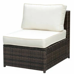 This faux wicker rattan six-piece sectional set is designed to create a unique seating arrangement. It offers comfortable cushioning with modular seating options wrapped in durable polyester canvas that’s easy to clean. Supported on sturdy platform bases, this brown and beige set is UV and water resistant with a faux rattan and aluminum frame. Enjoy the convenience of a tempered glass tabletop for setting drinks.