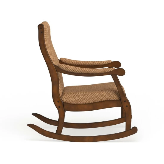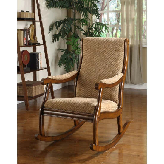 Rock your way to a relaxed, leisurely afternoon with this charming upholstered rocking chair from Furniture of America. You’ll enjoy comfort and relaxation with its cushioned, slightly curved back. Its plush seat features foam fill for comfort and support. Featuring a solid wood frame in a warm oak finish, this rocking chair enhances your transitional style in a sunroom or library. Padded arms offer additional comfort, and fabric upholstery stands up daily wear and tear.