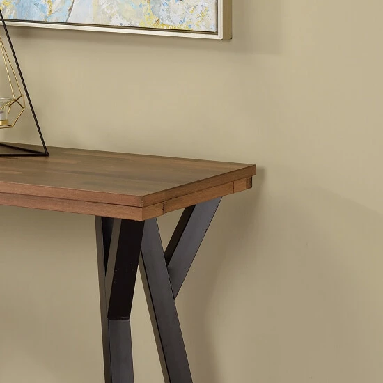 Complete a living room or den in style with this charming, farmhouse style console table. From the flared, geometric base to the wood grain accents on each surface, it adds a touch of character to any living space. The table features a spacious rectangular surface with an open bottom shelf for convenient storage space.