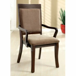 The Cins armchair is the perfect formal piece that will add elegance to any dining decor with its abundance of architectural detail. This set of two walnut and brown dining chairs by Furniture of America offers intricate designs, including lineal molding on the top of the frame that flows down to the elegantly curved arms. These wood armchairs chairs include foam filled cushioning for comfortable seating and creative collaboration supports that will truly bring out its traditional design. A deep walnut finish and beautiful plush cushions add style and class to these stately wooden armchairs. Place them around the table in a formal dining area, or add them to an entryway as an accent. These chairs are also at home in a parlor or formal living room, adding additional seating where it’s needed.