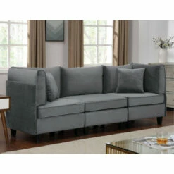 Invitingly plush whether it’s time for a nap or hosting friends, this contemporary three-seat sofa provides comfortable seating. Tall side cushions and tight upholstery feature velvety soft grey fabric that lends a modern look to a clean, precise silhouette.