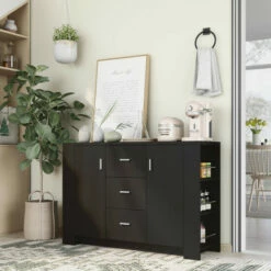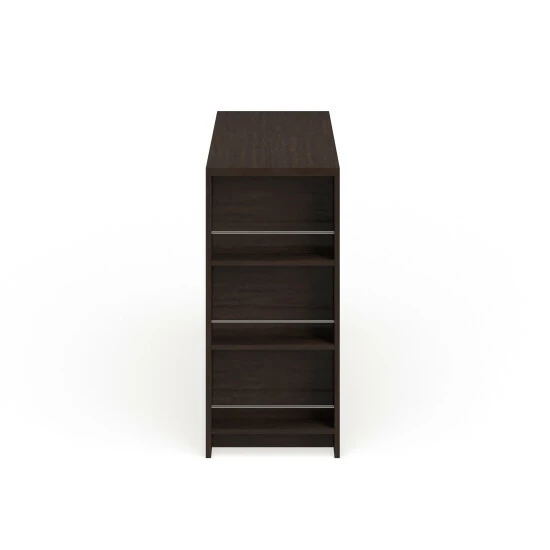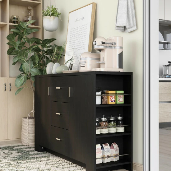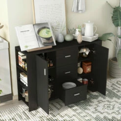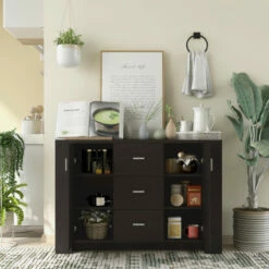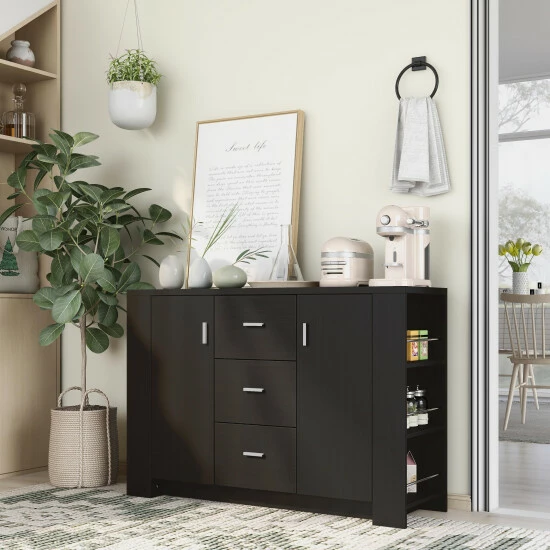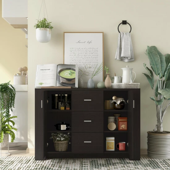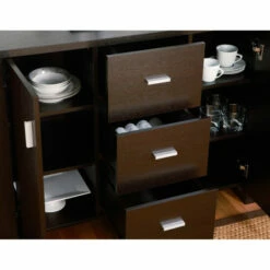 Add extra storage to your dining space with this stylish buffet. The buffet is crafted from wood and MDF with cappuccino finish veneers and includes three center drawers, and two cabinets, each with three shelves inside to stowing extra dishes and table linens. Four open shelves on each side of the buffet provide easy access to frequently used items, adding convenience to this chic buffet.