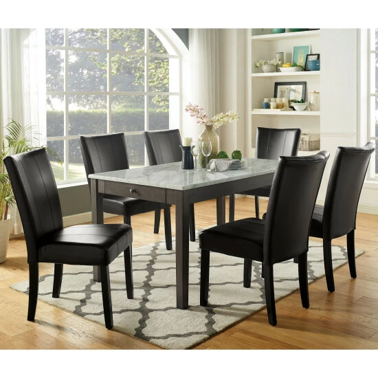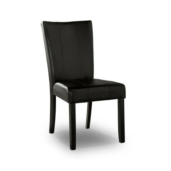 From the Furniture of America Cloe collection comes this elegant set of two transitional side chairs, adding some rustic, charm-infused style and comfort to a dining room space. With a classic Parson style design and flared, curved high backrest, each chair features a cushioned seat wrapped in a dark grey faux leather. Two stitching details run through the seat, adding a contemporary look to the set. Each padded chair also rests on gently tapered legs with a black finish that matches the upholstery. Included in this FOA set is also a matching dining table that can be purchased to tie your dining space together.