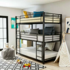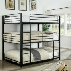 Save space in your children’s bedroom with this triple-decker bunk bed from the Furniture of America Cody collection. Expertly crafted from metal, this stable bed is designed to last for a long time and offers upper guard rails that prevent kids from rolling off the beds and provides a slat kit as a solid foundation for mattresses. Its sand black finish that lends to its handsome, minimal look and works effortlessly with any color palette. Perfect for a more contemporary home, this bunk bed trio also offers two secure ladders to reach each respective bunk. It’s also available in several sizes to accommodate any space.