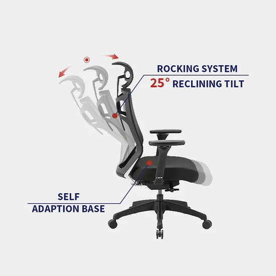 This home desk chair features a rocking system with a 25° reclining tilt. Combined with a soft fabric seat cushion on a self-adaption base, this desk chair makes a comfortable seat. Height adjustable armrests and lumbar support add to the ergonomic design.