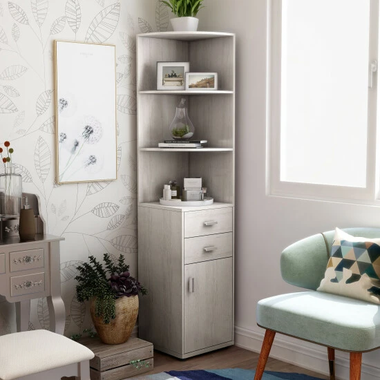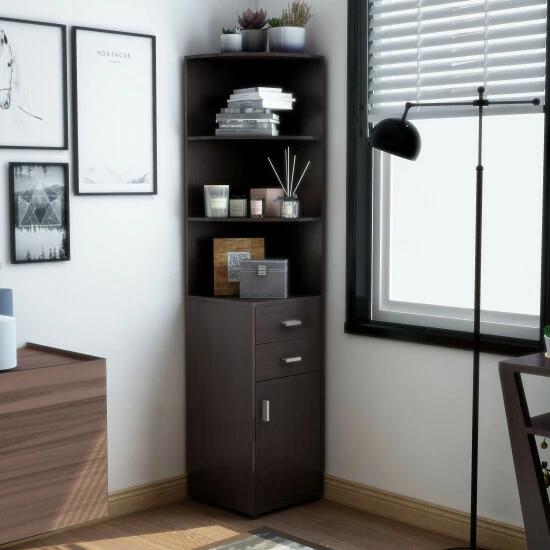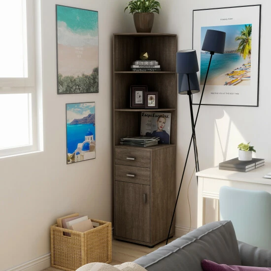 Make use of every inch in your contemporary living area or bedroom with this Colvain corner display cabinet. It’s perfect for showing off personal treasures while adding space to stash assorted odds and ends in its lower drawers and cabinet. Its compelling profile adds visual interest to clean, minimalist lines and an on-trend finish.