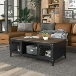The rustic appeal of this coffee table will give any loft apartment that modern grunge style. A dark walnut tabletop adds comfort to the san black powder-coated frame. Dual-side access wire-mesh cabinets lend space for storage while maintaining that rustic touch.