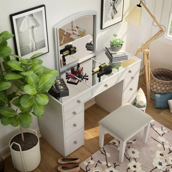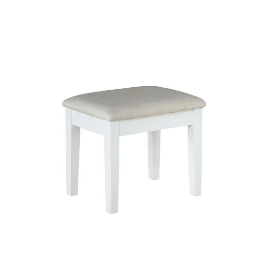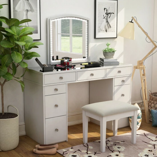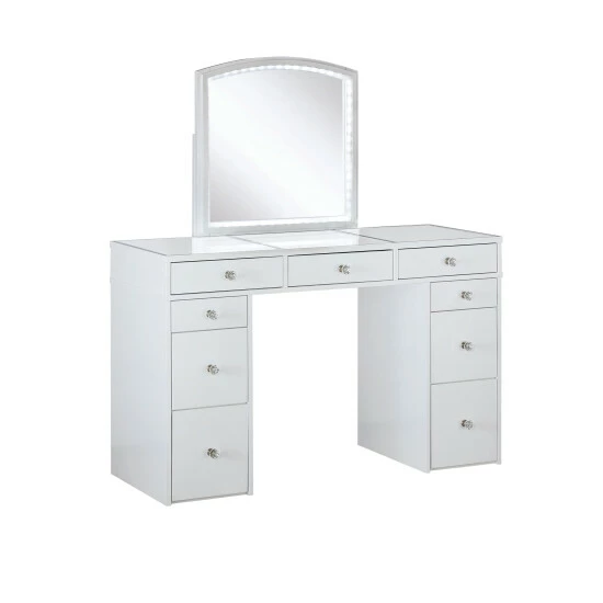 Enjoy the chic versatility of this delightful transitional vanity set from Furniture of America, which features a vanity, matching stool, and LED mirror. Crafted from solid wood and veneer in a brilliant white finish, this vanity set gives your space a stunning, coordinated look. The vanity features an LED lighted 3mm slightly arched mirror and nine drawers with crystal inspired drawer pulls that provide functionality, fashion, and generous storage. Enjoy your prep time on the stool with its white cushion that’s plush and comfortable and stands on solid block legs that taper. This vanity set makes a lovely addition to shabby chic bedroom or walk-in closet.