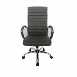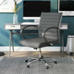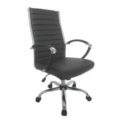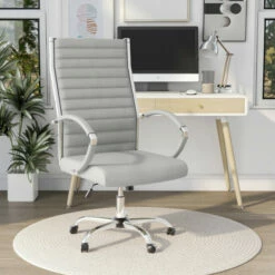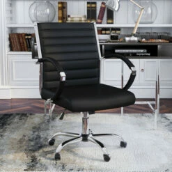 This modern desk chair is a modest look that fits well in almost any home office. The horizontally tufted backrest keeps clean cleans while the chrome frame lends a chic design. A bar on the back is the perfect rack for a hanger to preserve a wrinkle-free suit jacket.