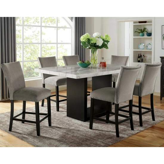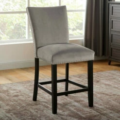 From the Furniture of America Cots collection comes this set of two transitional counter height chairs, each of which blend ultra-modern elements into a classic, timeless design aesthetic. With each upholstered and flared Parson style chair, you will find a soft and comfortable grey flannelette fabric as well as a nailhead trim detail that runs down the entire length of the seat. This chair set lends a charming rustic touch that is perfectly suited for a modern farmhouse style home. Black finished, tapered legs offer support and a clean, minimalist style as well as foot supports to brace yourself with. In this same collection, you can find a matching dining table as well as a standard height dining collection.