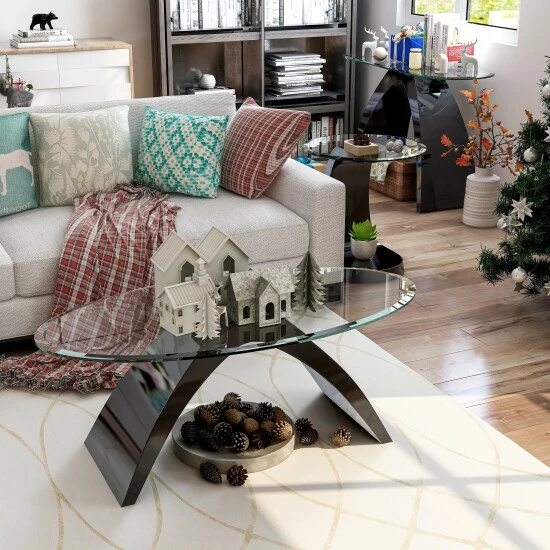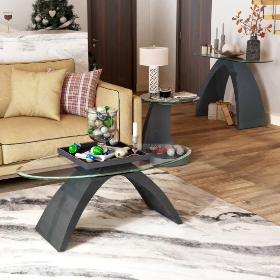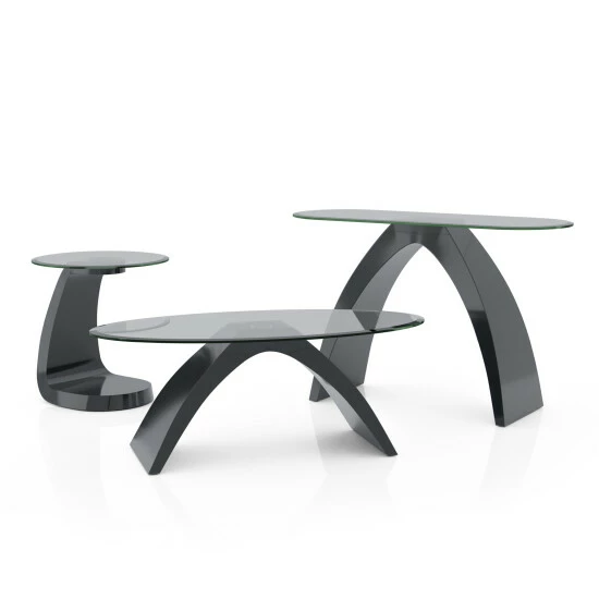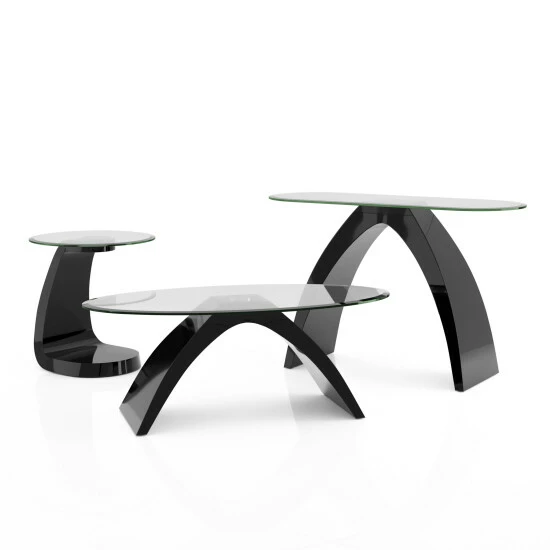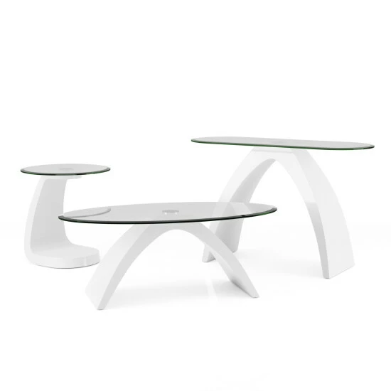 Add a retro-inspired, futuristic touch to a modern living room with this strikingly elegant three-piece coffee table set. Each piece features curvy arched and cantilever bases with sweeping shapes and a lustrous high gloss finish that adds a glamorous flair. Resting on the bases is a rounded tempered glass top, each with a beveled edge that adds a softness to the dramatic look. Place this furniture set among a seating arrangement and create a resting space for snacks, refreshments, and books.