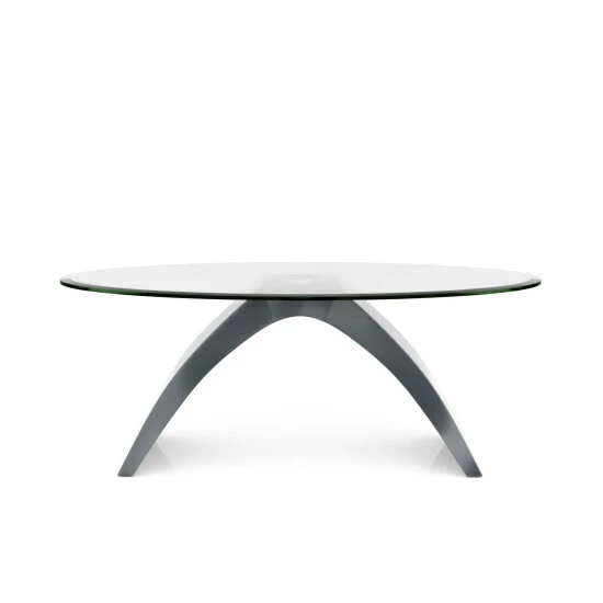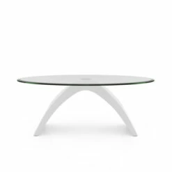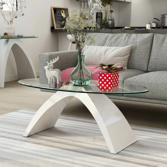 With an arched base design in a lustrous high gloss finish, this sleek coffee table is the perfect addition to a modern living room seating arrangement. Topped with a clear tempered glass top in a long oval shape, this furniture piece adds a touch of elegant glamorous. Along the tabletop is a classic beveled edge that softens the clean-lined, hard-edge look. Place this coffee table in front of a sofa to create a striking centerpiece.