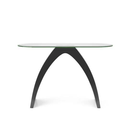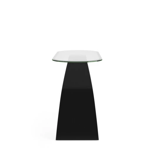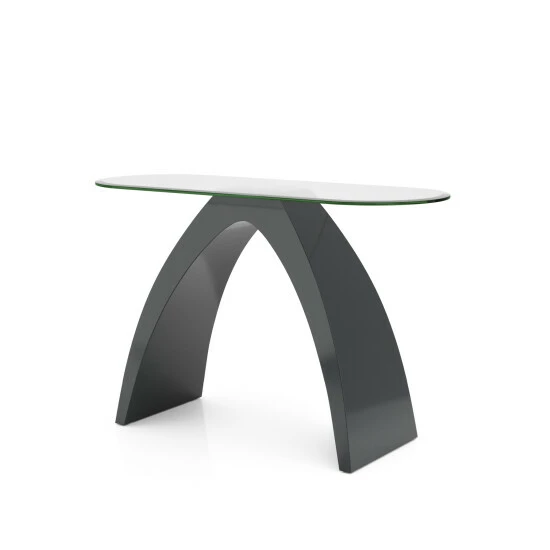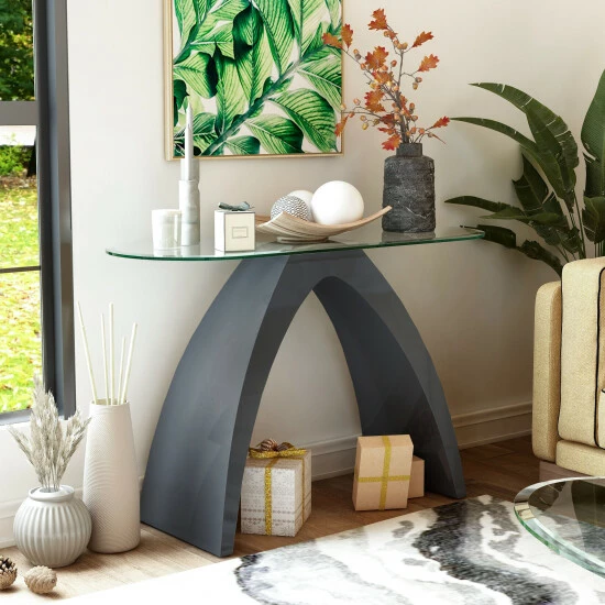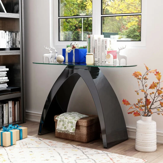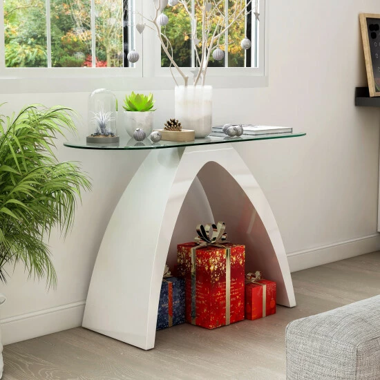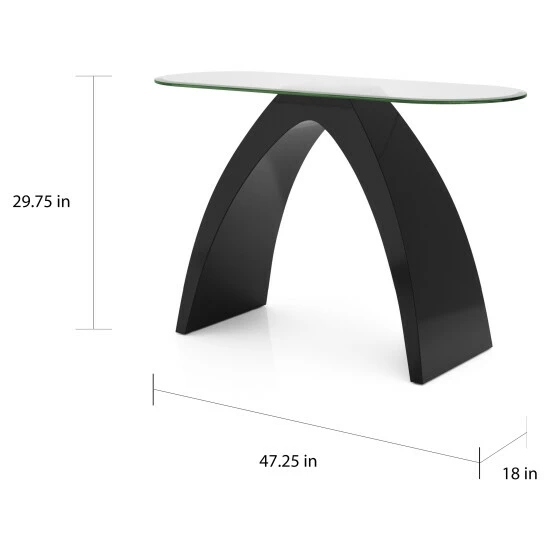 Add a futuristic touch to a space with this elegant modern sofa table. A striking visual focal point, this sofa table offers and tall arched base in a shiny high gloss finish. This furniture piece is also topped with a clear tempered glass in an elongated shape with softly rounded ends and a beveled edge. Place this sofa table behind a couch or within an entryway for an eye-catching style.