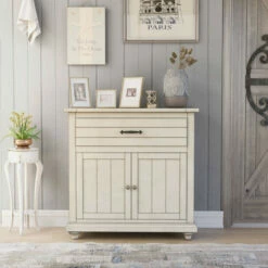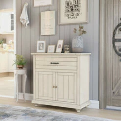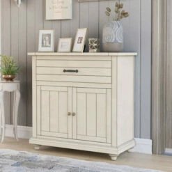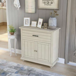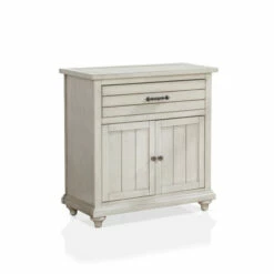 Set the tone in a coastal or cottage entryway with this charming hallway cabinet. Complete with one drawer and interior storage behind two doors, the cabinet boasts a warm antique white finish. Plank style elements decorate both the door and drawer fronts, creating both vertical and horizontal elements. An eye-catching drawer pull boasts a twisted motif and bun-inspired tapering feet adds a classic touch.