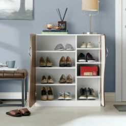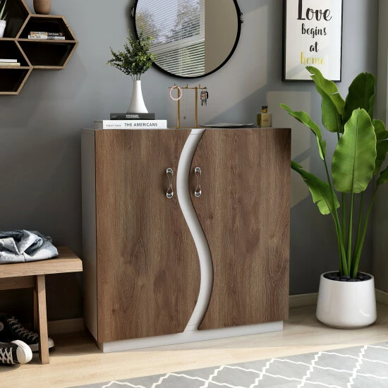 Complement your artistic, modern decor while keeping your shoes organized with this handy shoe cabinet. The Daki cabinet features a two-tone finish and a unique, wavy design on the front. Eight shelves provide plenty of space for all your favorite shoes.