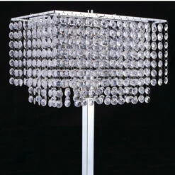 Put a little glamor into your life with this gorgeous diamond faux crystal table lamp that showcases a chic dangling shade and sparkling silver finish. The square design of the shade paired with the clean, linear base creates a sophisticated look with sleek appeal.