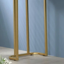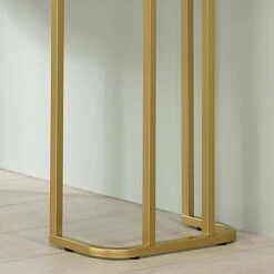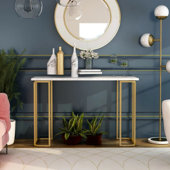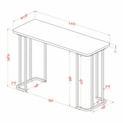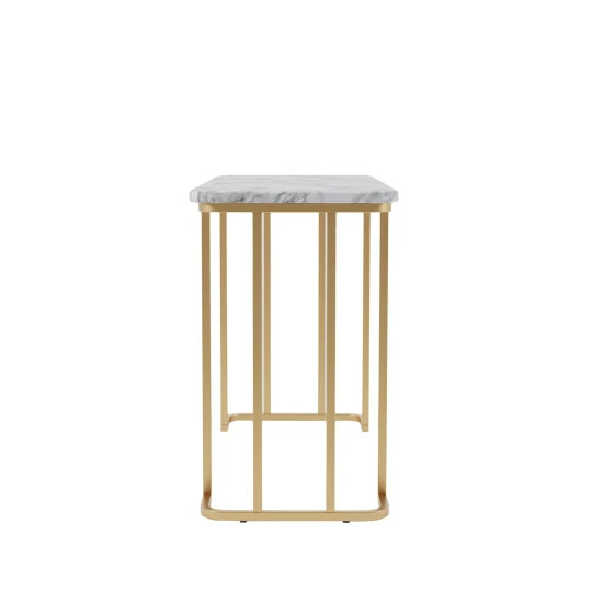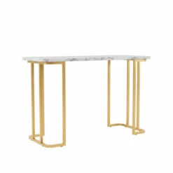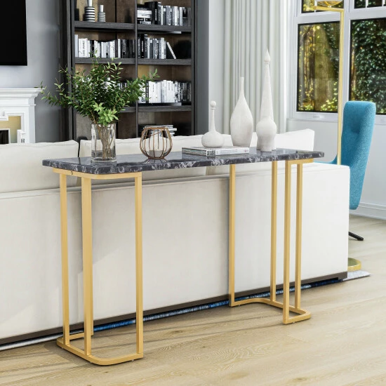 Sleek and elegant, this rectangular sofa table makes any living room look more sophisticated. A faux marble top with smooth, rounded corners sets the stylish tone for this exquisite piece. The metal base forms graceful curves and slim, straight lines to complete the design’s upscale vibe.