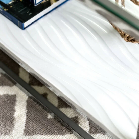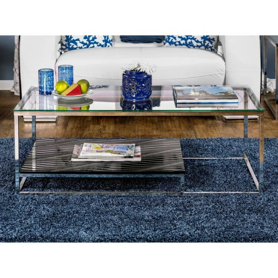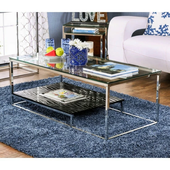 Update your living room with this classy yet fun and modern coffee table from Furniture of America. The grooved and textured wood panel shelf creates unique character while the glossy finish of this glass coffee table looks beautiful in any modern setting. Its glass rectangular tabletop makes your space feel larger and airy with plenty of room to place decorative items and beverages. Customize the shelf finish in your choice of black or white to more closely match your precise decorating style. This modern and contemporary coffee table is ideal for living rooms that are contemporary or modern in decor.