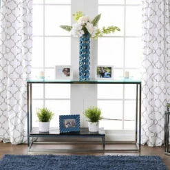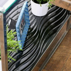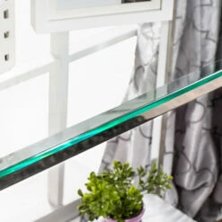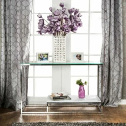 Update your living room with this classy yet fun and modern sofa table from Furniture of America. The grooved and textured wood panel shelf creates unique character while the glossy finish of this glass sofa table looks beautiful in any modern setting. Its glass tabletop makes your space look sleek and airy with plenty of room to place decorative items, candles, and photo frames. Customize the shelf finish in your choice of black or white to more closely match your precise decorating style. This modern and contemporary sofa table is ideal for living rooms that are contemporary or modern in decor.