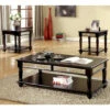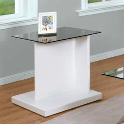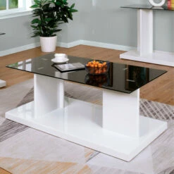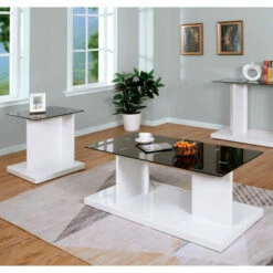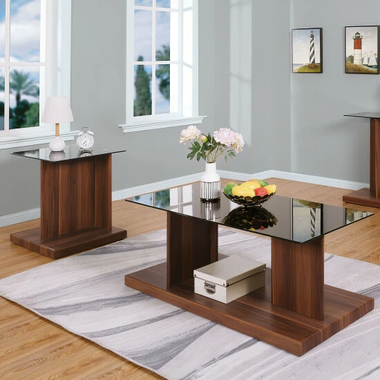 Reimagine your modern living are or family room with the lustrous elegance of this contemporary two-piece living room table set. Smoked black glass tabletops add a sense of mystery to bold, sculptural bases brimming with eye-catching flair.