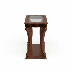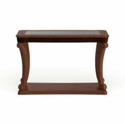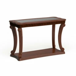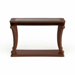 Cabriole legs, scalloped edges and intricate carved trim work mix with harmony within this Furniture of America Derg Traditional Glass Sofa Table. A lower shelf with parquet style surface provides a spot for displaying books, decorative items, or simply adding extra storage space to your living room. Thin curved lines over a diamond shape are laser etched into the glass of the coffee table, adding a touch of artistic flair to this chic, elegant piece. The base is crafted of wood and wood veneers in a deep, rich, dark oak finish that adds a stunningly sophisticated vibe. Pair this sofa table with a matching coffee table and end table, sold separately, to instantly elevate the look of your living space.