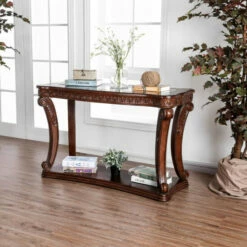 Cabriole legs, scalloped edges and intricate carved trim work mix with harmony within this Furniture of America Derg Traditional Glass Sofa Table. A lower shelf with parquet style surface provides a spot for displaying books, decorative items, or simply adding extra storage space to your living room. Thin curved lines over a diamond shape are laser etched into the glass of the coffee table, adding a touch of artistic flair to this chic, elegant piece. The base is crafted of wood and wood veneers in a deep, rich, dark oak finish that adds a stunningly sophisticated vibe. Pair this sofa table with a matching coffee table and end table, sold separately, to instantly elevate the look of your living space.