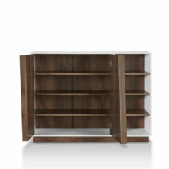 Stay organized in your home with this contemporary white storage cabinet from Furniture of America. This white and distressed walnut shoe cabinet is bound to bring organization to entryways, mudrooms, and more. A two-tone finish gives this cabinet an interesting look that blends with other furnishings. Ideal for rustic and casual settings, you can’t go wrong with this piece.