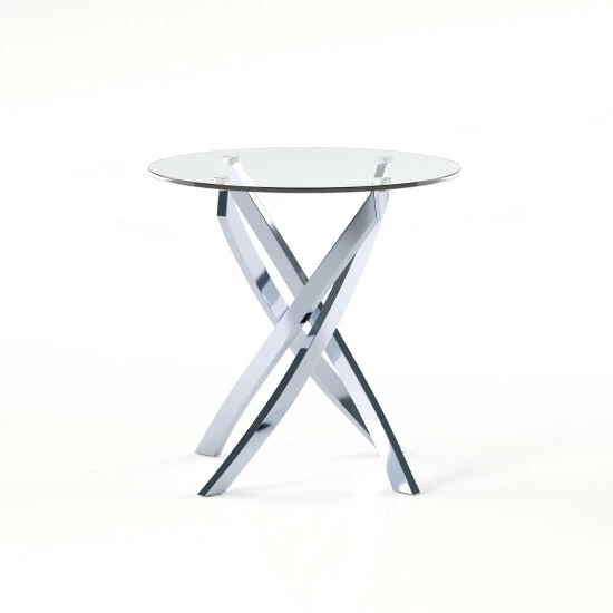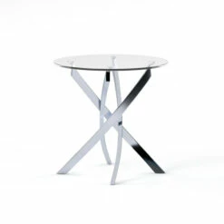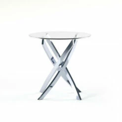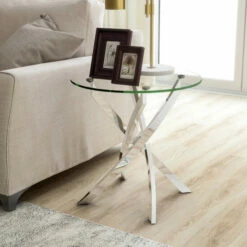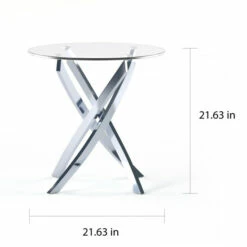 Add modern appeal to your home with this 22-inch round side table. The round 10mm tempered glass top sits on four sleek crisscross leg panels. The attractive base boasts a twisted design that is charming and contemporary, serving as a sculpture in itself with lasting durability.