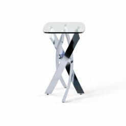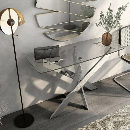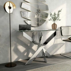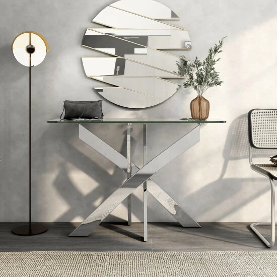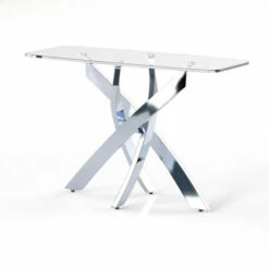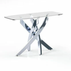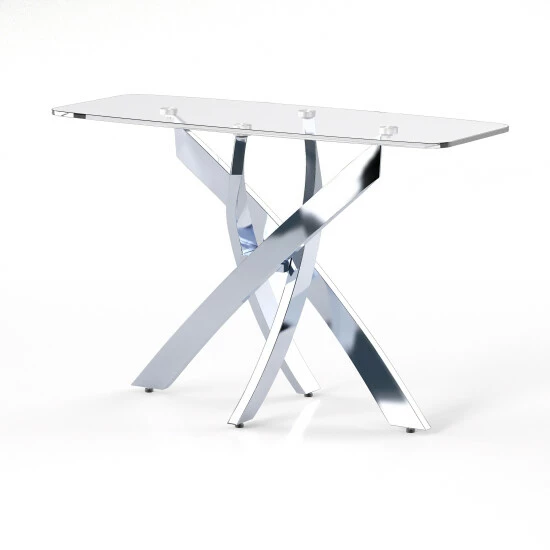 Modernize your living space with this spectacular contemporary sofa table. This table is built with tempered glass top for an open, airy feel. The oblong design is perfect for tight spaces, while its criss-cross metal base has a shiny chrome finish. Made from metal and glass, this piece is ideal for any theme.