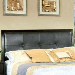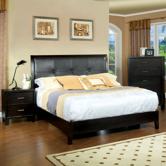 Elevate your bedroom’s natural style with this espresso finished platform bed from Furniture of America. The sophisticated button-tufted and foam-filled headboard lend comfort and grace, while its design features a low profile that makes getting in and out of bed easier. With its rich, modern espresso finish, this bed coordinates beautifully with many styles of home decor, while its simple style and clean lines pair beautifully with most bedding. Manufactured from quality hardwood, metal, wood veneers, and smooth faux leather, this built-to-last platform bed offers years of use, whether you place it in your master suite or guest room. Choose the size that best accommodates the needs of your space or your existing mattress.