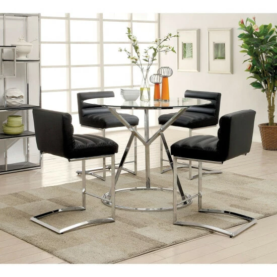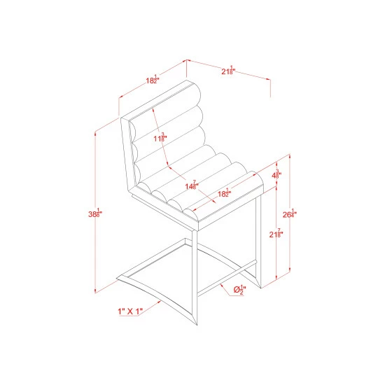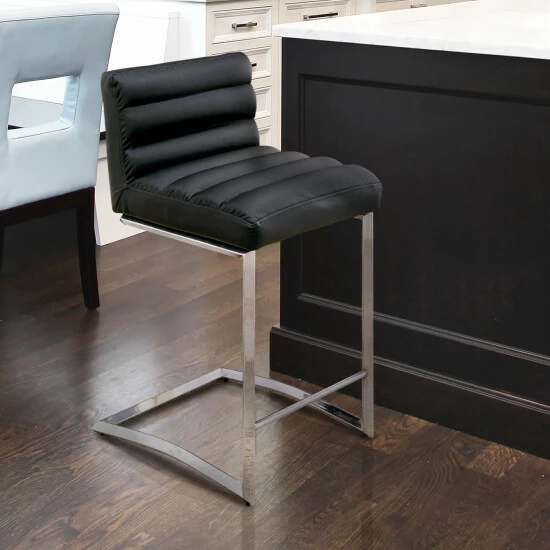 This pair of two counter height dining chairs from the Diti collection lend a sleek, ultra-modern design aesthetic to a dining area. With L-shaped legs in a shiny metal chrome finish, these tall and sophisticated chairs capture and reflect your existing color palette, blending in with surrounding decor. Sit for many long hours enjoying a delicious meal or an engaging conversation on their comfortable and plushly padded seats, complete with a low-profile backrest. In addition, each channel tufted seat lends a contemporary look with a retro touch. Wrapped in a smooth faux leather upholstery with stitching detail, these chairs provide a chic look that will create quite the statement!