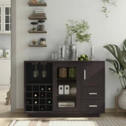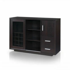 Contemporary vibes define the crisp design of the Diz wine bar from Furniture of America, offering a silhouette of clean lines that handle serving and entertaining in a modern space. This elegant server is constructed of MDF with a deep cappuccino finish and metal hardware that add refinement and sophistication. Carefully arranged storage spaces include three center shelves and a side cabinet with slots that hold up to 16 bottles of wine, either of which may be concealed by a sliding door closure. Two drawers and a closed cabinet leave room for serve ware and accessories, and a stemware rack keeps glasses safe. This one-stop entertaining venue delivers a tastefully clean look with a host of function.