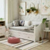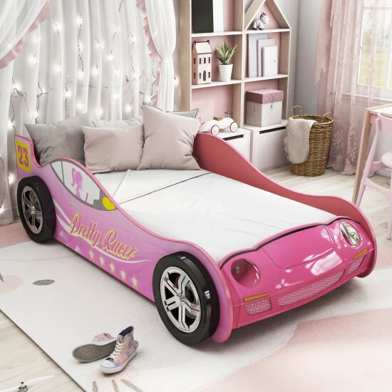For your race car-loving princess, this sleek pink novelty headboard shelf car bed from Furniture of America has convenience to match the racing inspired design. The sporty design and cool graphics spark your child’s imagination and is the perfect focal point for any bedroom with its glossy pink finish. The headboard features a cool rear spoiler in the form of a convenient shelf for hold in electronic devices, games, and toys, while the footboard features headlights and realistic looking grill that get pulses racing. The side doors emblazoned with cool words and graphics, as well as a silhouette of a ponytailed race car driver, double as protective guards to keep your child safe and secure. This scintillating car bed set will turbo-charge the visions in any child’s dreams.