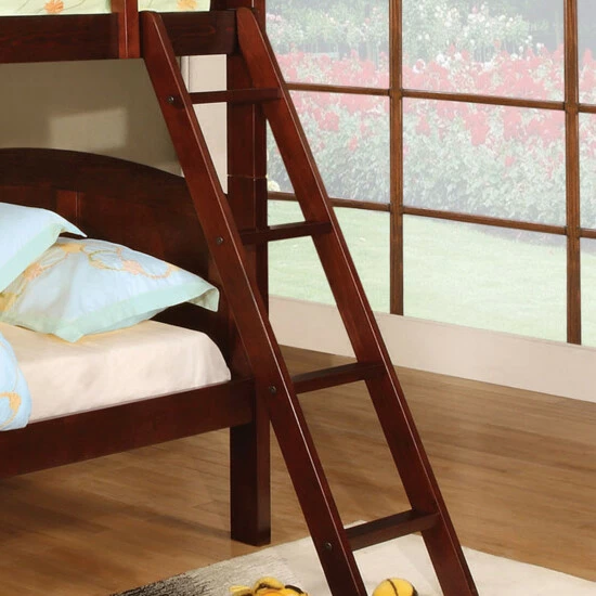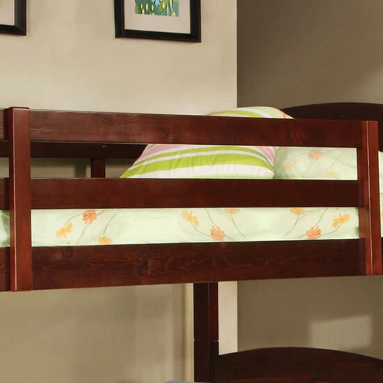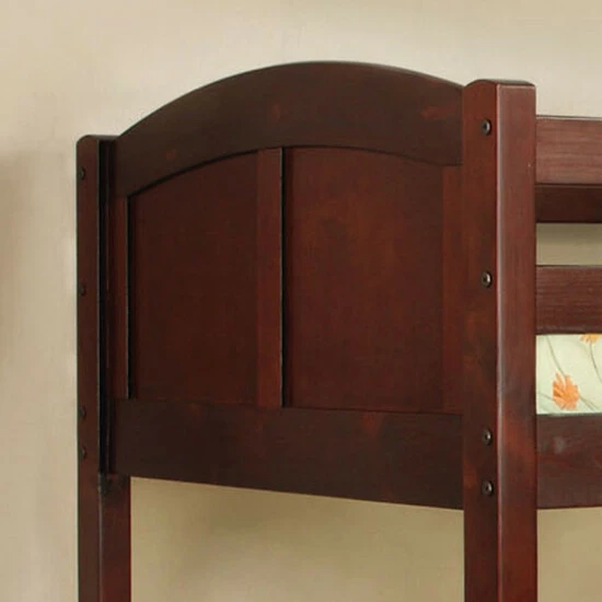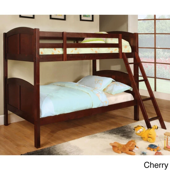 Simply constructed to maximize space while offering comfortable furnishings, this delightful twin-over-twin bunk bed from the Furniture of America Dons collection features a gently curving headboard and footboard. Available in dark walnut, this stacked twin bunk bed is suited for any transitional style bedroom or home. Extra safety features include a secure angled ladder, an insert and lock joint structure, as well as slatted railings along the top bunk to keep kids from falling during the night. A full slat kit is included, allowing for extra support and stability of a mattress to prevent sagging.