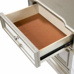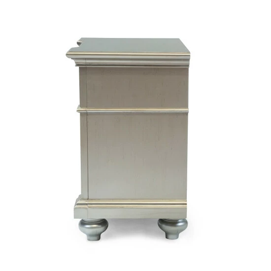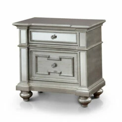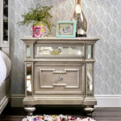 Give your bedroom a touch of glam style with the Eaen nightstand from Furniture of America. The champagne-finished wood frame has two drawers with dovetail construction and full-extension metal glides. Mirrored paneling accents the sides and top drawer for modern shine.