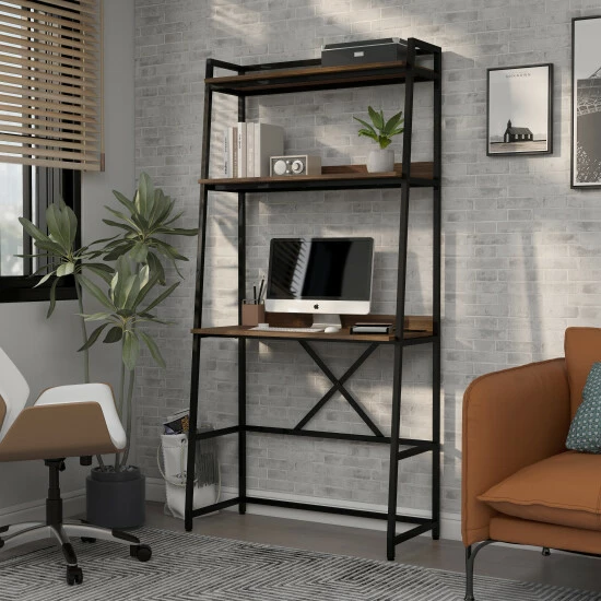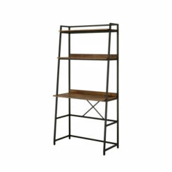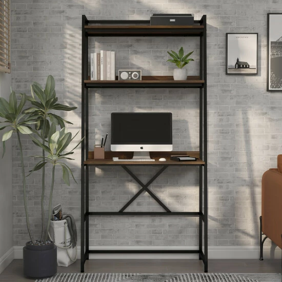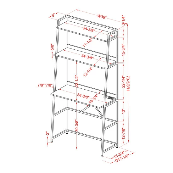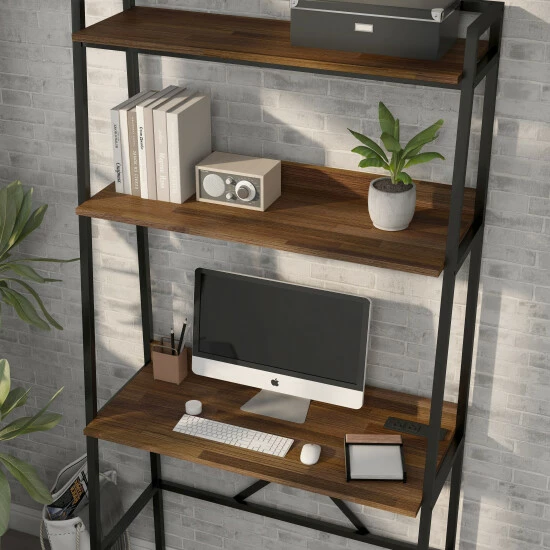 Perfect for the college student, this urban desk offers all your study space needs in one compact design. The two-tone desk doubles as a bookshelf with two upper shelves. Each surface is lipped for style and practicality. This protective barrier aids in upholding books while the desktop offers built-in outlets and USB ports for charging all your devices.