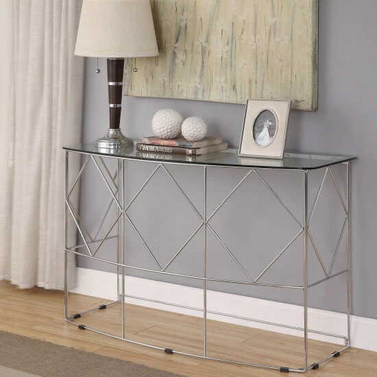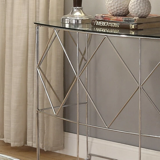 A light, airy design takes on sophistication fit for a fully contemporary space when the Eila glass and metal sofa table sits as an accent piece. Enrich a family room or living space with the modern brilliance of a classic. From Furniture of America, this exquisite sofa table delivers a geometric look with soft charm, as an open chrome finish steel base joins diamond shapes between support bars, forming a quadrilateral design. Add a curved rectangular sheet of thick clear beveled glass as a surface, and you have a shining example of true glam. Versatile and truly elegant, this glass and metal sofa table multiplies the wow factor in any space.