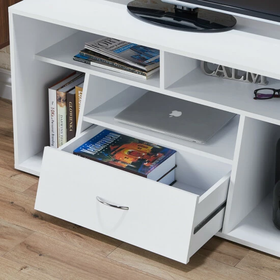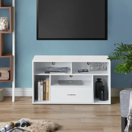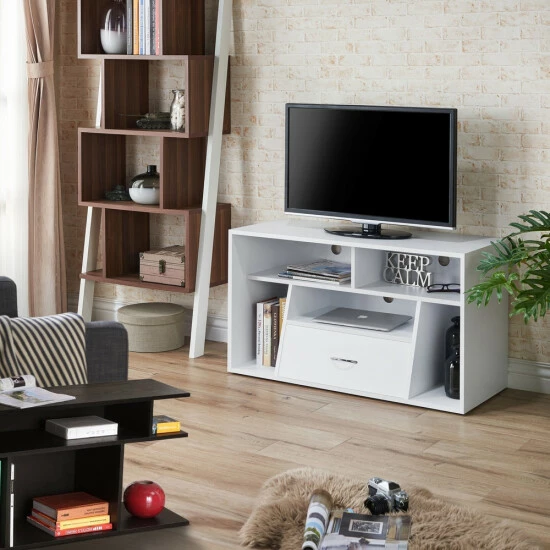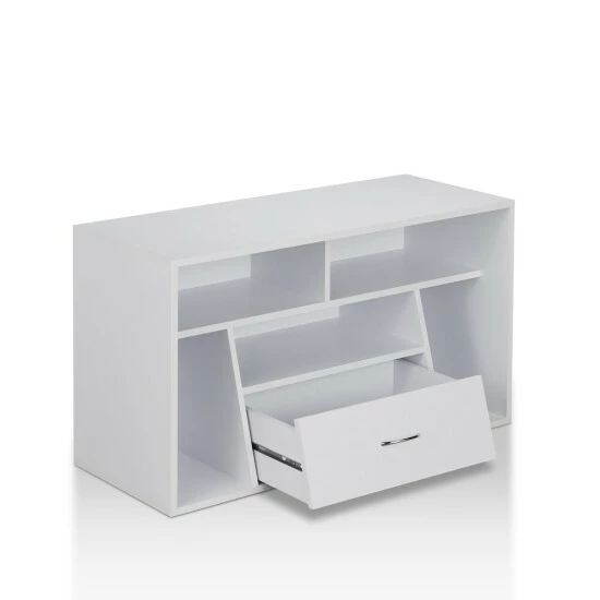 The Eldo Modern 39 Inch Storage TV Stand by Furniture of America features a simple modern design with clean defining lines. The space-efficient design works flawlessly in small spaces or bedrooms while its two stylish finishes blend easily with a wide range of home decor styles. The center drawer and shelf feature a beveled angle for a unique touch to this console. Offered in white or espresso, the TV stand is your versatile storage companion. With multiple rear-wiring access shelves, generous side compartments and a wide single drawer, the TV stand helps you find a place for all your entertainment needs.