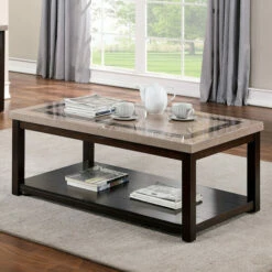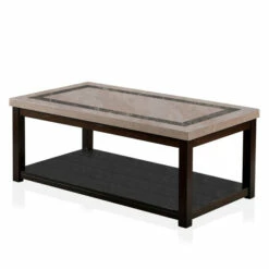 A coffee table with a geometric motif boasts a dark walnut finish and a faux marble top. The table has a clean appearance which is ideal for both modern and classic decor styles. A spacious tabletop and expansive lower shelf offer storage space.