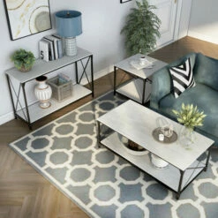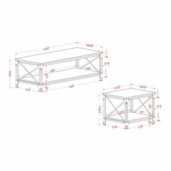 This transitional 3-piece coffee table set featuring a coffee table and two end tables from Furniture of America gives any home an edgy look with a rustic touch. Each table features a particle board top and bottom shelf in a cool gray finish, with sleek metal legs in black. The shelves and tops are spacious enough to store or display everything you need to make your space feel like home. In addition, the X-cross side designs and subtle wood grain details make a stylish statement in any home.
