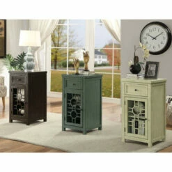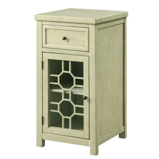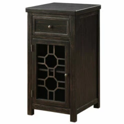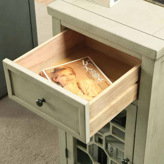 Appreciate the artisan value and quality of casual furniture with a tasteful piece designed to impress. The Emma transitional wood side table from Furniture of America fills several functions including essential hidden and semi-open storage and a romantic aged ambiance perfect for a low-key space. Solid wood and wood veneer construction craft a sturdy, solid piece with block legs, and a recessed side panel and drawer front. An ornate geometric cutout pattern allows a peek-a-boo view inside, to a shelf with space for storing books and décor. Round metal knobs add a sleek finishing touch. Choose this adorable table in one of three finish options to suit your custom palette.