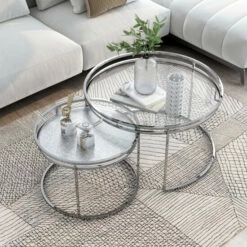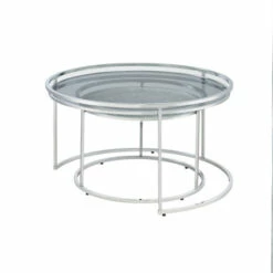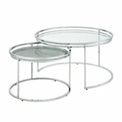 Create a waterfall display or bring a little added versatility to your compact living area with this two-piece nesting table set. In chrome with glass and mirror tabletops, the set gleams in the light and offers a rich, sophisticated ambiance brimming with sparkle.