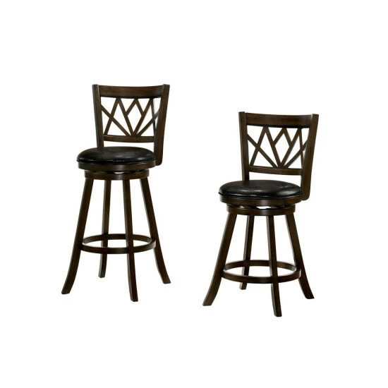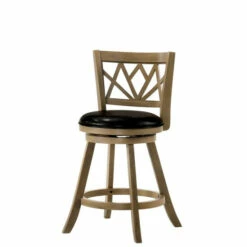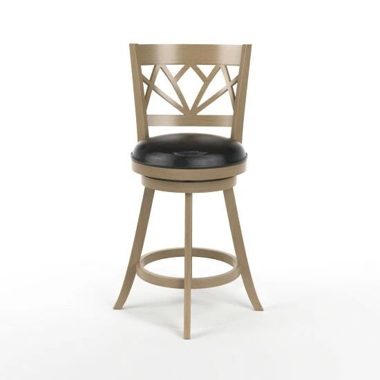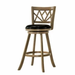 Showcasing a sleek geometric silhouette and a fresh two-tone finish, the Epona contemporary swivel bar stool offers plenty of choices for customizing a stylish casual space. Indulge in a love of playful design with a stool that’s destined to embellish a kitchen, nook, or main living space. Its solid wood and wood veneer construction frame resembles a geometric puzzle motif with extra verve, adding a cutout back and gently curved top. A padded seat wrapped in faux leather or fabric offers a fun swivel motion, and a four-post base unit with flared, tapered legs and a ring footrest add to a sleek silhouette. The Epona swivel bar stool is available in different finish, fabric, and height options.