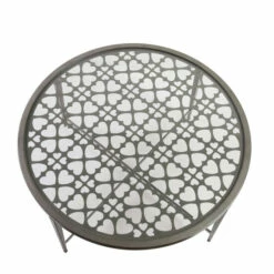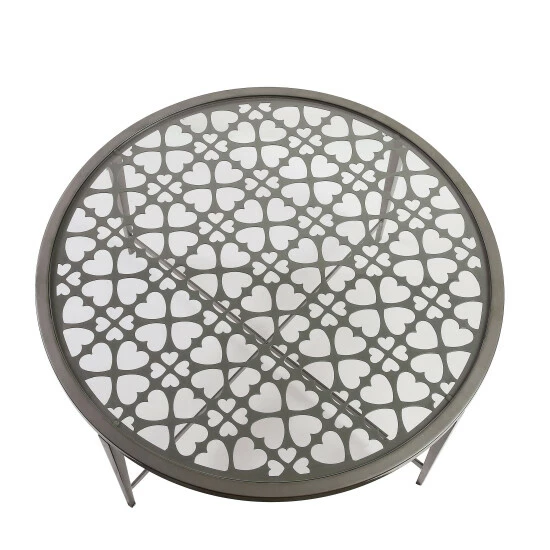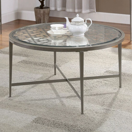 Provide a sophisticated place to put down drinks and snacks with this accent coffee table set from Furniture of America. Created for the Fage collection, this piece features steel legs to provide firm support to the tempered glass round tabletops. A heart motif adorns the glass top for a sweet and special touch for your living space. Attractive and durable, the X-shaped base ensures extra stability. This round coffee table combines its metal structure and thin tapered legs with the silver satin-plated finish to make this table the ideal centerpiece in your living area. Choose this coffee table to add contemporary and modern appeal to your space.